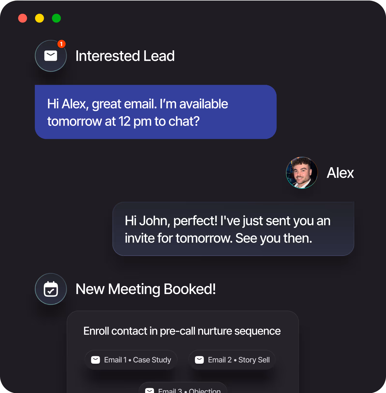 We send value-based outreach that gets replies, then use expert reply-handling and smart pre-call nurture to turn those replies into booked meetings with prospects who are excited to speak with you. While most agencies stop at a reply, we go further, which is why our clients see industry-best results and why we can make this guarantee. Book a demo to see how it works, the results you can expect and get any questions answered.